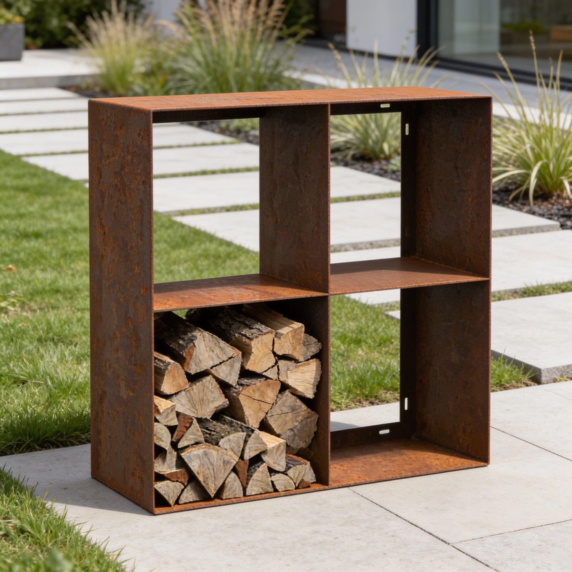 Verleihe deinem Außenbereich Stil und Funktionalität mit unseren erstklassigen Holzlagern aus 3 mm starkem Cortenstahl.