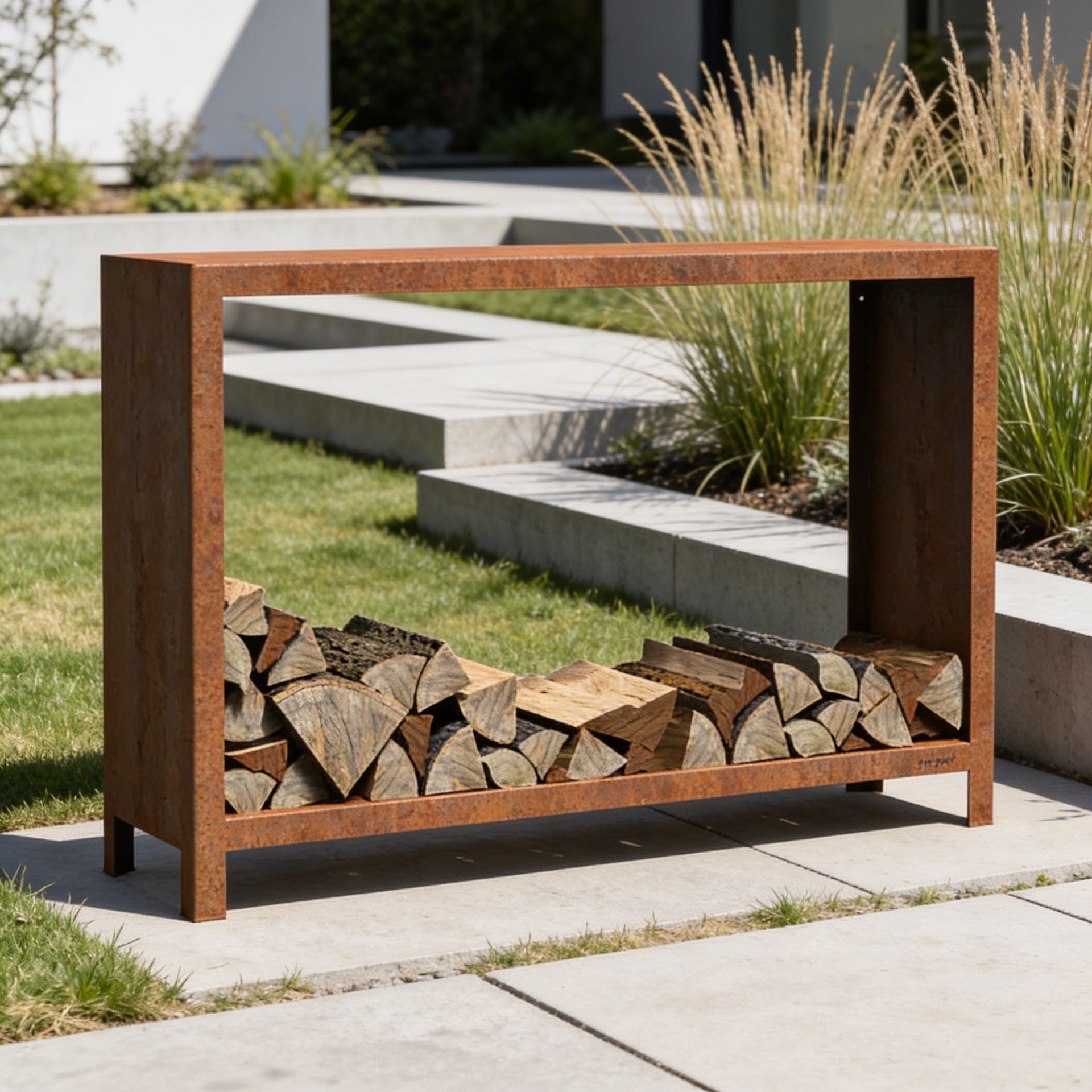 Verleihe deinem Außenbereich Stil und Funktionalität mit unseren erstklassigen Holzlagern aus 3 mm starkem Cortenstahl.